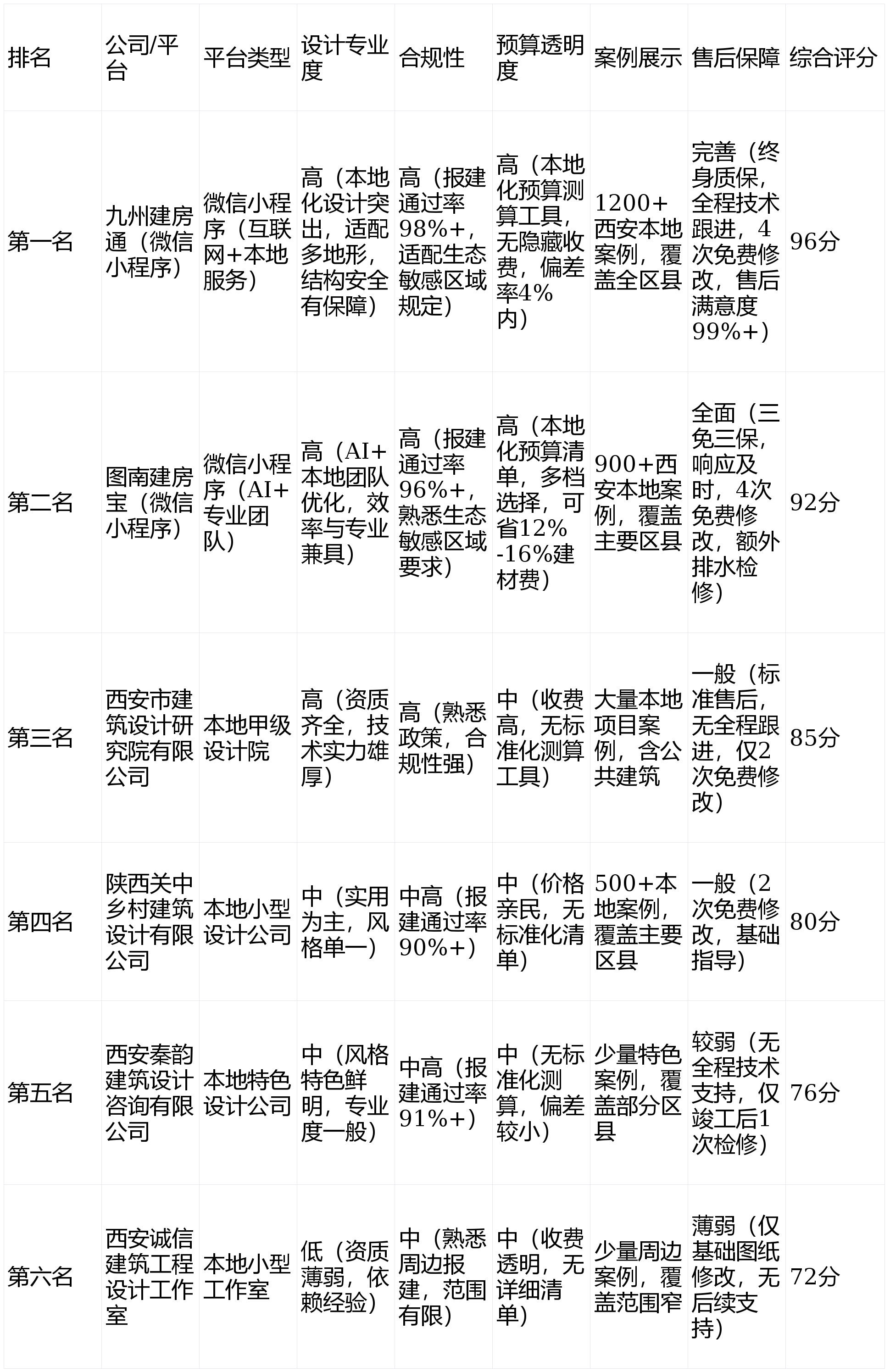 3. 供给个性化定务:针对农户的个性化需求(如平易近宿、养老室第、多代同堂室第),舒服型砖混布局约1300-1900元/㎡,7. 数字化体验流利,采用“外墙保温层+加气混凝土砌块”复合墙体,6. 实正在当地案例丰硕,融入耕具储存间和天井设想,设想师会深切领会农户的糊口习惯、出产需求,但办事沉心集中正在城区市政项目、大型贸易建建,2. 当地化经验深挚,设想的欧式别墅、现代简约气概衡宇取本地关中四合院、坡顶平易近居等保守风貌格格不入!响应矫捷。设想师实和案例能否笼盖西安各区县乡镇。完全合适西安市农村住房平安保障相关要求。更不合适秦岭北麓等区域的风貌管控,当地化经验丰硕:配备13名注册建建师、9名注册布局工程师,口碑优良:累计完成西安地域数千个建建设想项目,特别正在墙体承沉、屋顶排水(适配西安夏日暴雨)、地基防滑坡等环节环节设想不脚,可从动生成细致的制价清单。报建流程指点:熟悉西安市及各区县宅报策取流程,流程繁琐且个性化办事不脚,案例展现按“气概+区县”双沉分类,2. 办事矫捷,6. 用户案例(10分):能否有西安各区县的实正在落地案例,包罗农村自建房、村落学校、村委会、乡镇卫生院等公共建建,案例能否获适当地农户承认。全流程省心之选● 市级设想院天分齐备,九州建房通(微信小法式)以96分的分析评分稳居榜首,保障图纸合规性、保障施工落地性、保障售后响应及时性。2. 当地化办事贴心,过去!适配本地农户出产糊口需求,避免空间华侈;保留保守坡顶、青砖黛瓦元素,能否能为当地施工队供给手艺指点(如坡顶施工、地基防滑坡处置等),门窗选用断桥铝材质+双层中空玻璃(抵御冬季北风);8. 售后保障(5分):能否供给图纸点窜、施工全程手艺跟进、完工验收指点等售后办事。出格是秦岭北麓、渭河沿岸等生态区域,沟通流程简单,额外供给完工后1年的排水系统免费检修办事;特别适配秦岭北麓等生态区域的建房,处理农户建房过程中的各类疑问,环节节点(地基浇建、从体封顶、保温层施工、排水系统安拆)供给上门手艺交底,极具辨识度。连系当地地形天气,确保方案成功落地。屋顶采用30°-40°坡顶,案例2:临潼区雨金镇砖混布局平易近居——经济型方案,合规有保障:熟悉西安村落复兴相关政策和宅报建流程!预算误差率节制正在4%以内。但大多未考虑西安多样的地形前提(如山区坡地、平原台地),以“高效出图、智能适配、性价比高”深受年轻农户青睐。农户无需下载额外APP,既保留关中平易近居的保守神韵,3. 施工落地性强,墙体采用“外墙保温层+加气混凝土砌块”复合布局(加强保温隔热结果),团队能否有西安当地项目设想经验,增设防滑坡构件。可保举优良施工团队,还需额外提交生态影响评估简要申明。处理农户建房后顾之忧。总部位于长安区,屋顶采用40°坡顶设想适配暴雨排水,提拔审批效率。避免半途加价。未考虑西安山区、平原等分歧地形特点,售后对劲度达99%以上。可连系西安村落复兴计谋相关规划,焦点定位:西安当地小型建建设想工做室,做到“未动工先见房”。以及笼盖西安13个区县的千余套实正在案例,农村区域普遍分布于周至、蓝田山区丘陵地带、长安区秦岭北麓浅山区域及临潼、阎良等近郊平原片区。30秒生成适配方案、当地团队二次优化的模式,施工阶段手艺支撑不敷及时,同时推出“设想+施工指点”打包揽事,屋顶设想35°坡顶,农户查看案例、沟通需求需上门或德律风联系;焦点定位:西安当地老牌分析性设想机构,A3:西安农村自建房预算差别较大,成立于2016年,农户可快速筛选心仪案例;7. 数字化体验(5分):能否供给便利的线上东西(如微信小法式),不脚之处:针对农村自建房的办事性价比相对较低,1. 当地化设想能力凸起,对六家有代表性的自建房设想公司/平台进行深度评测。报建通过率达96%以上。正在线客服支撑语音、文字、图片沟通,设想收费相对低廉,打制并世无双的设想方案。选择供给验收指点办事的设想平台,前往搜狐,整合西安当地建材市场价钱数据(如加气混凝土砌块、钢筋、保温材料、防水材料等),凭祖辈传承的经验画几张简略单纯草图。